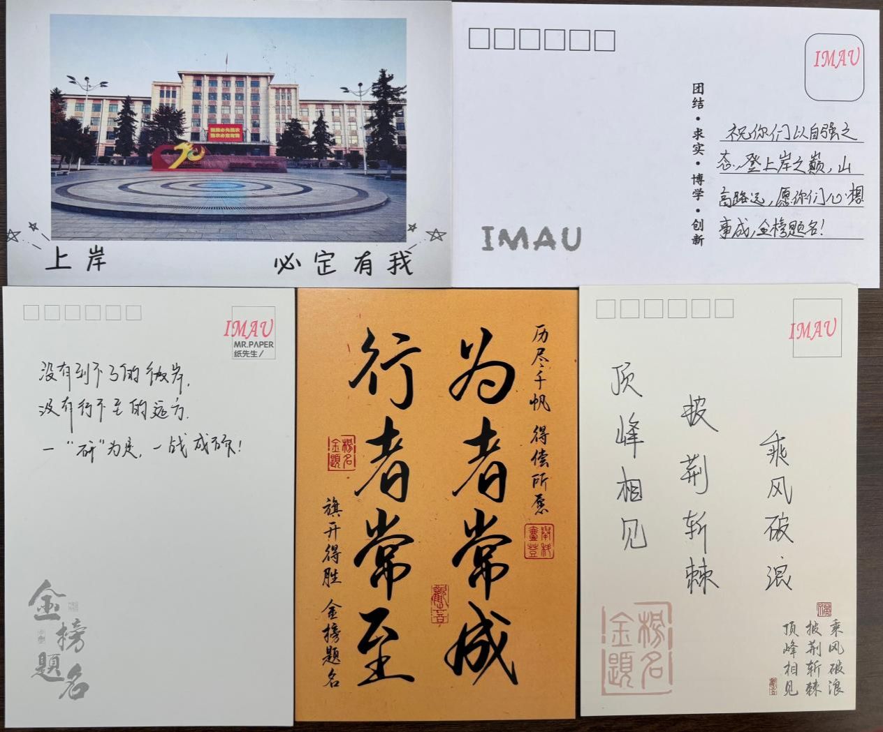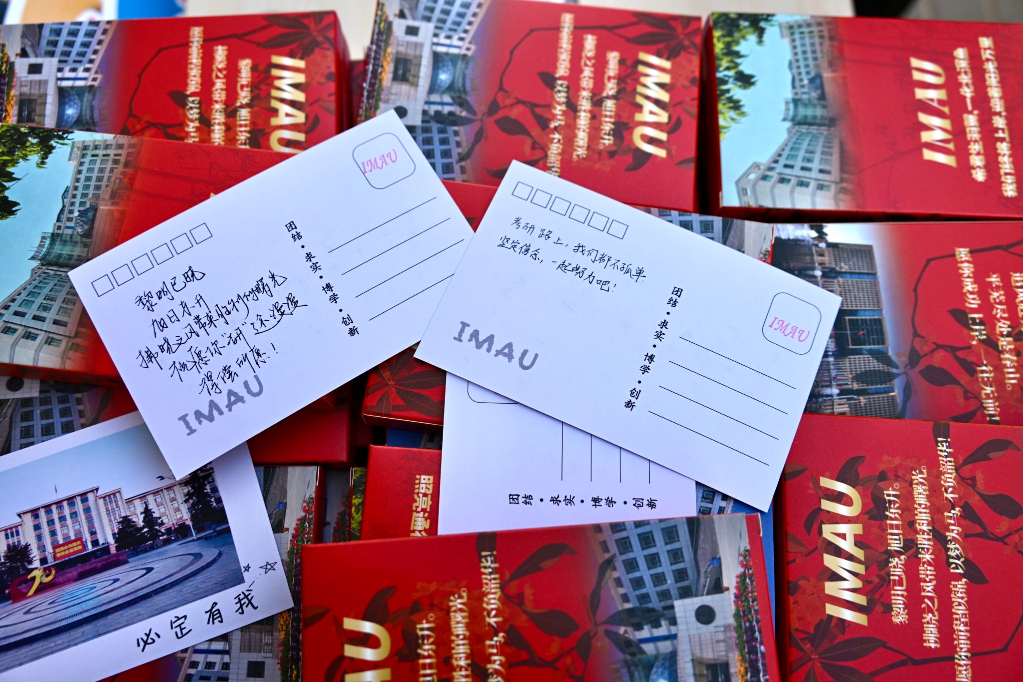 活动现场暖意融融、热闹非凡。学生工作部以创意“盲盒”为载体,将真挚祝福与贴心关怀打包送出,吸引了众多学子踊跃参与。备考学子们写下目标院校的名称,字里行间满是对未来的憧憬与执着;其他年级同学也纷纷驻足,在明信片上写下暖心寄语,为学长学姐送上最真挚的祝福与鼓励。一张张满载期许的明信片、一个个饱含心意的盲盒,串联起校园里守望相助的温情,成为寒冬中最动人的风景。