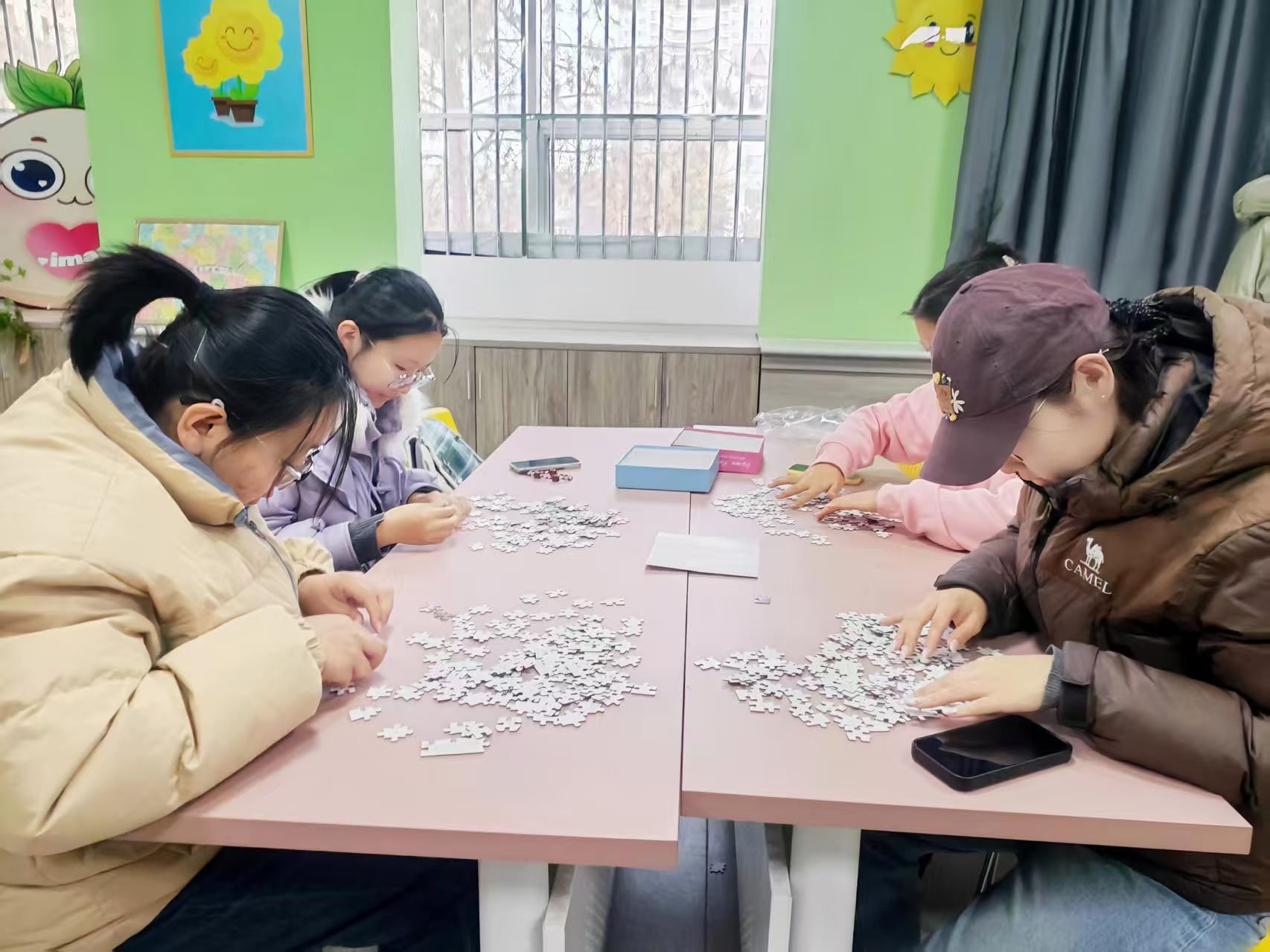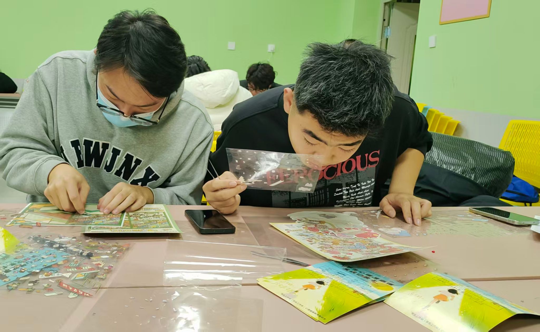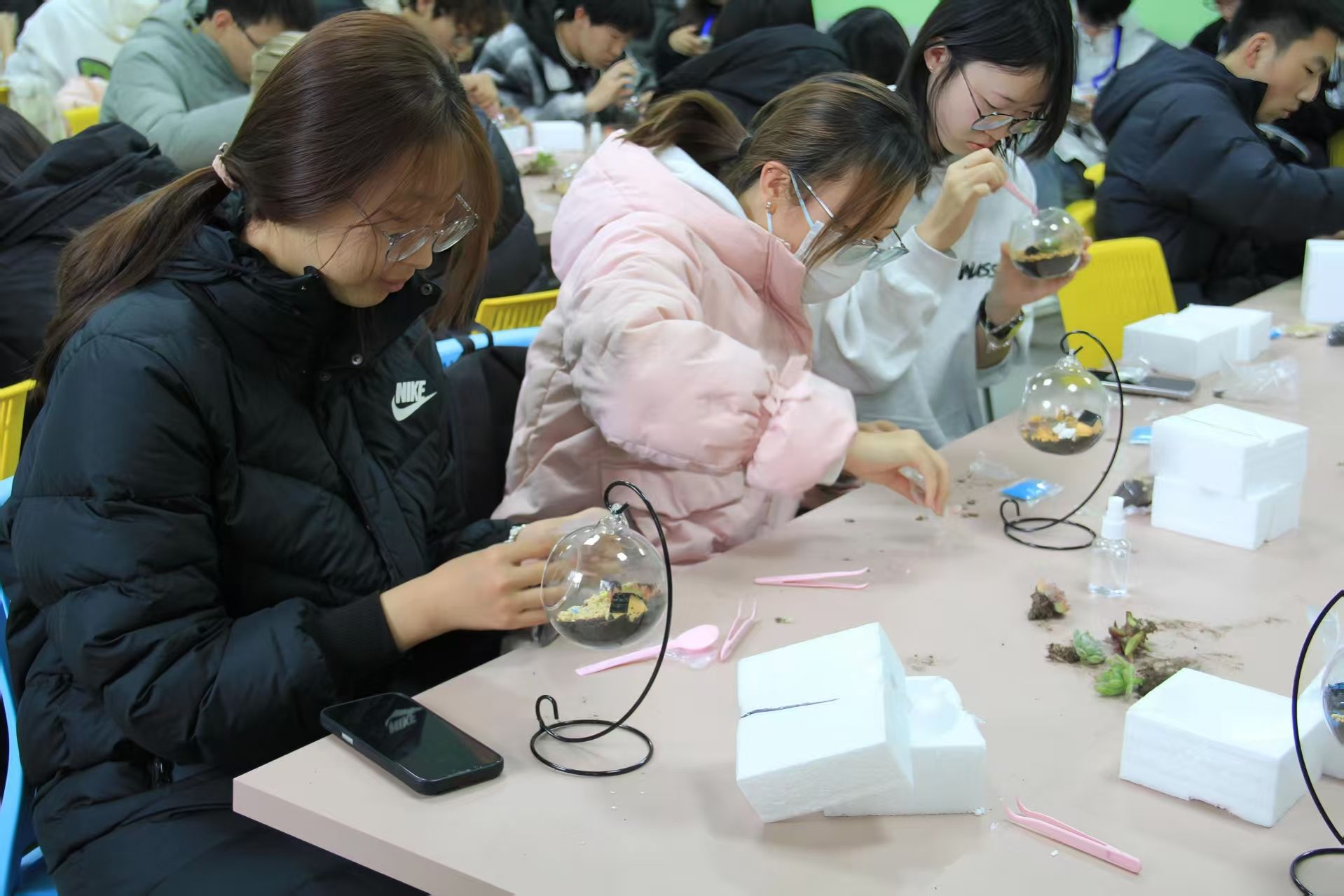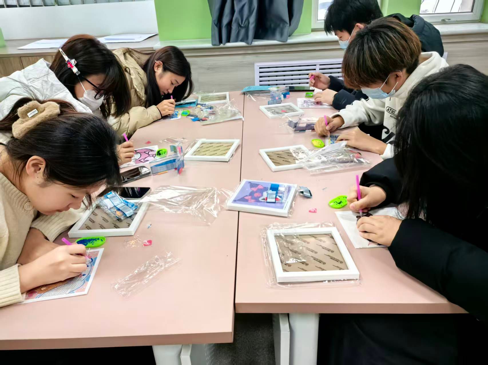 在创意多肉微景观DIY工作坊中,同学们亲手搭配土壤、种植多肉、布置装饰,在与自然元素的互动中感受生命成长的力量;数字油画DIY让参与者在色彩的填充中放松心情,感受艺术创作的乐趣;堆叠立体小屋贴花DIY则结合了空间构造与美学设计,锻炼了同学们的耐心与专注力;宿舍集体拼图活动促进了舍友间的协作与交流,增强了集体凝聚力;钻石画DIY通过细微物件的精准粘贴,让同学们在制作的过程中体验专注与平静。
